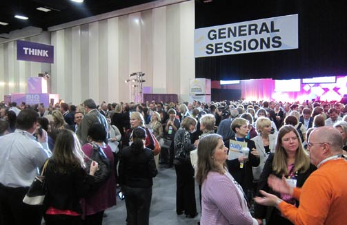 At breakfast the next day, all attendees receive two forms: one to fill out their own MVP player accomplishments and another to fill out for a colleague they admire, who is attending the convention. All attendees who fill out forms are eligible to have their photo taken for their own two-sided MVP player card, enlarged to poster size. The poster of the attendee who is most written up by his or her colleagues is blown up to wall size and mounted on a wall the last day of the convention, when the person’s name is announced with game music in the background and a rally squad dancing to celebrate.